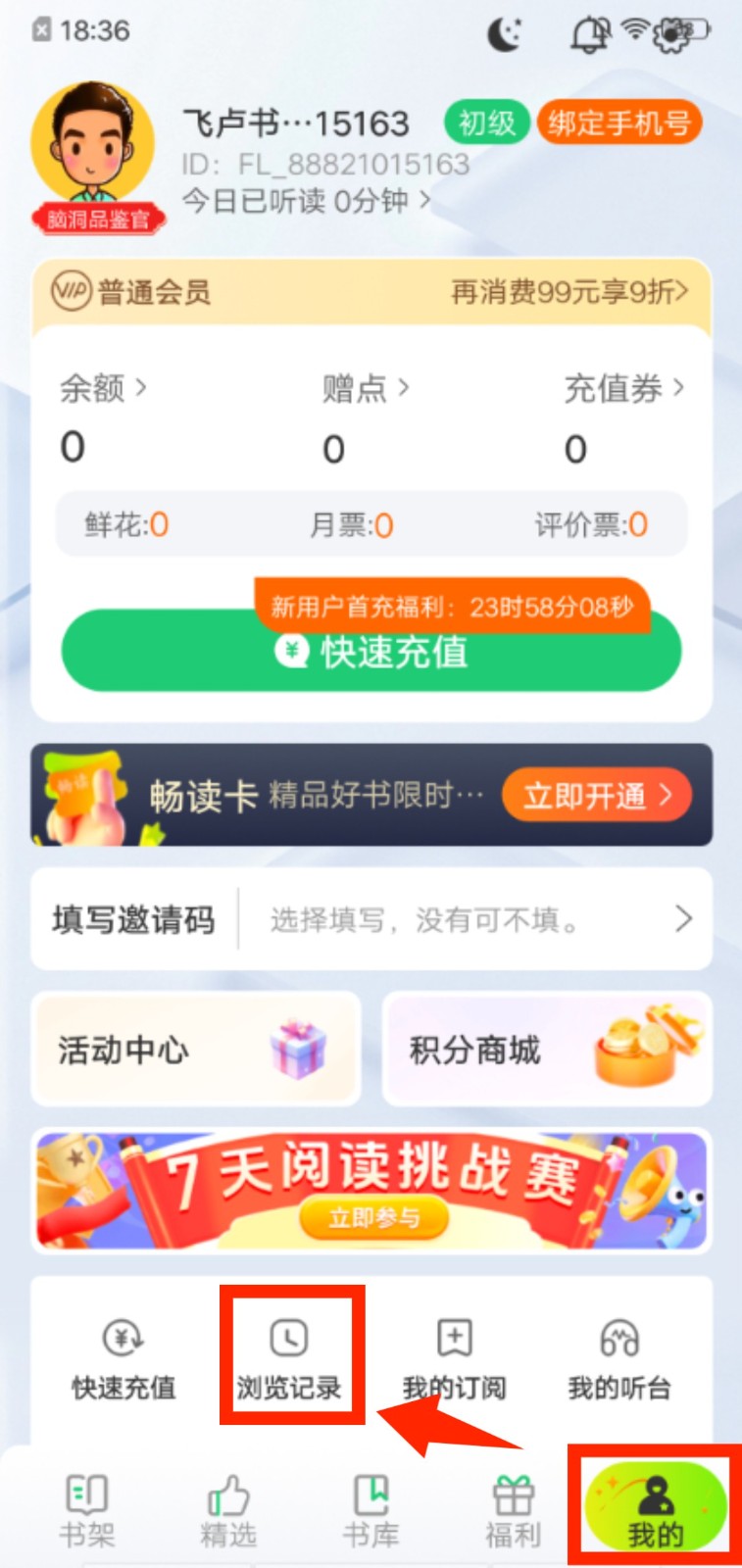 4、点击底部 “我的”,在个人页面点击 “浏览记录”,可查看过往的书籍浏览情况。
