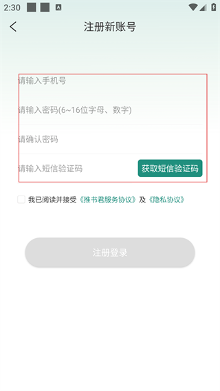4、在注册新账号界面,依次输入手机号、密码、确认密码,点击【注册登录】,即可完成新账号注册操作。