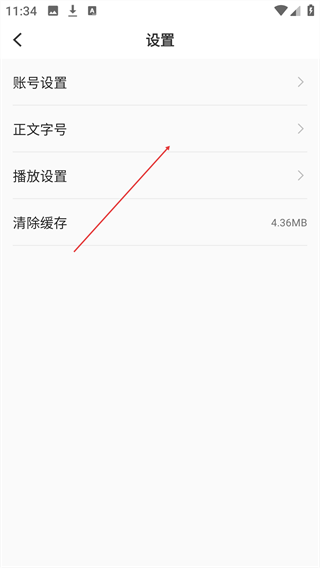 3、在设置页,点击【正文字号】选项,进入字号选择界面。