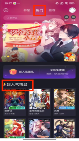 1 、首页顶部有书架、热门、推荐选项卡,中间是横幅广告与 “超人气精品” 栏目,底部展示漫画作品。