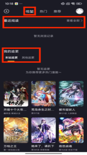 2 、书架页面顶部显示 “最近阅读” 与搜索框,中间列出阅读记录,下方有 “我的追更” 分类及推荐作品。