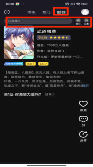 3 、推荐页面顶部有搜索框与筛选按钮,中间展示 “武道独尊” 作品详情,包含人气数据与更新信息。