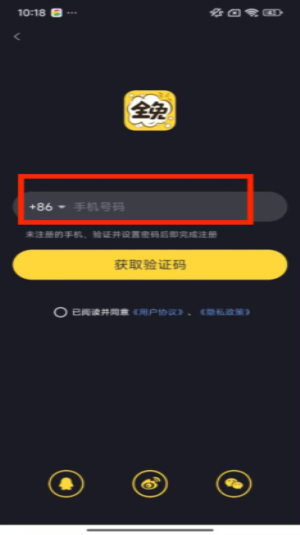 4 、登录页面中央有 “全免” 图标,下方是手机号输入框与获取验证码按钮,底部有用户协议勾选框。