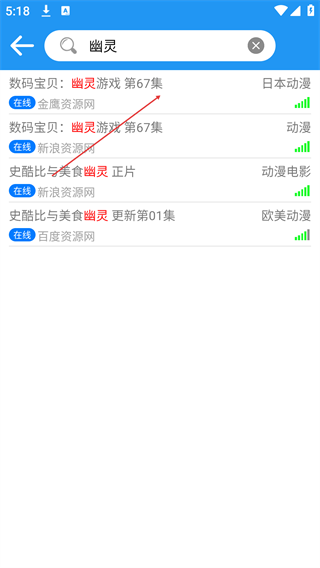 3、在搜索结果列表中,选择目标动漫条目(如《数码宝贝:幽灵游戏 第67集》),进入该动漫的播放页面。