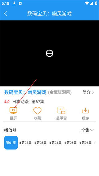 4、在动漫播放页面,可使用【投屏】功能将内容投射至外部设备。