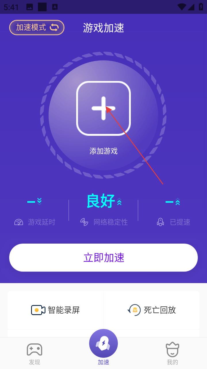 1、在游戏加速页面,点击【添加游戏】,可进入添加本地应用页面,选择需要加速的游戏。