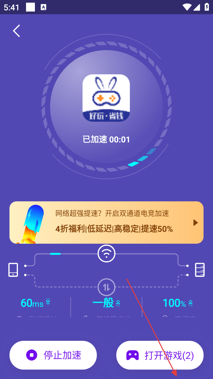 4、加速完成后,可查看游戏加速时长及网络状态,也可点击【打开游戏】直接启动加速后的游戏。