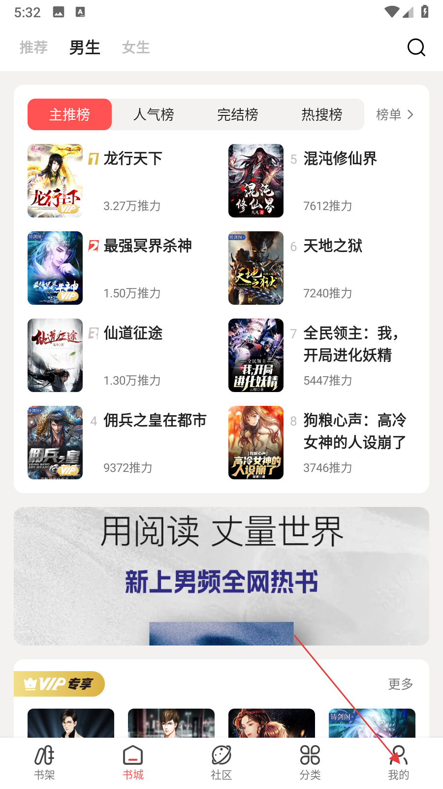 1、在快读免费小说APP书城页面,点击右下角【我的】,进入个人中心页面。