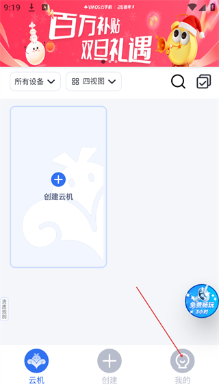 1、进入App主界面,可点击“创建云机”开通云手机服务,底部【我的】入口进入个人中心。