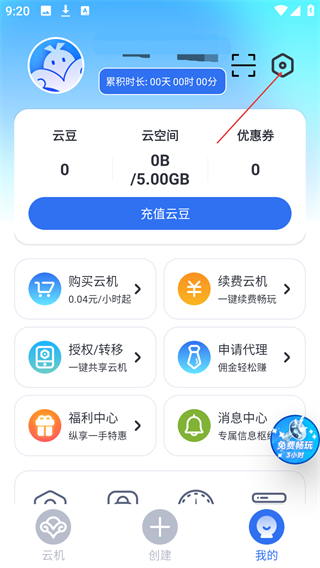 2、在个人中心,可查看云豆、云空间等资源,支持“购买云机”“续费云机”“云机授权/转移”等操作,点击个人中心的设置按钮。