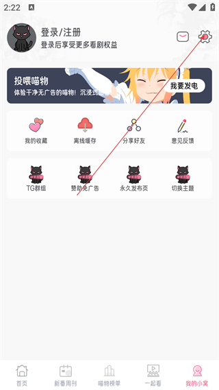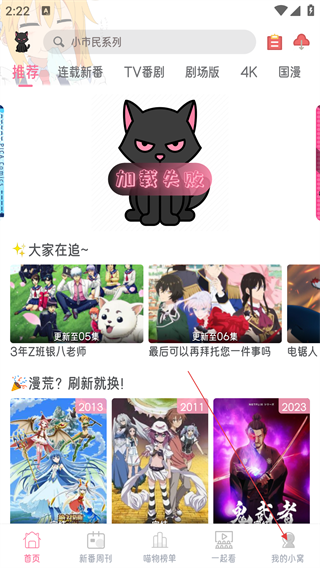 1、进入软件首页,可浏览《3年Z班银八老师》《电锯人》等推荐动漫,点击底部【我的小窝】。