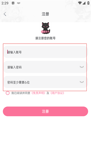 4、注册时需输入账号、设置至少6位的密码,勾选同意《免责声明》及《用户协议》后点击【注册】,即可拥有个人账号使用软件功能。