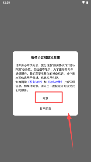 1、阅读服务协议后点击“同意”,允许收集设备标识以优化性能。