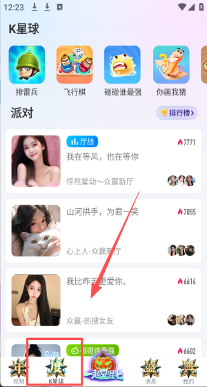 3、进K星球选派对游戏或排雷,实时语音互动秒速结识新友。