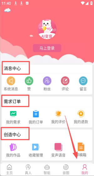 1、先登录消息中心查收系统通知,再点创造中心上传试音作品。