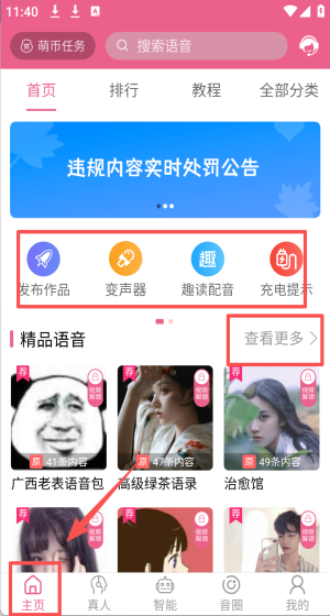 2、回首页浏览精品排行与分类,点教程学会发布高能变声作品。