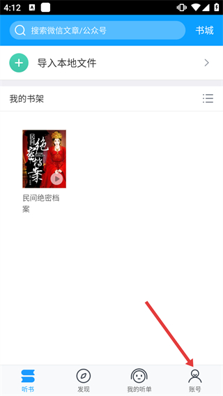 1、在“爱听书”的听书页面,点击底部“账号”选项,进入包含登录、功能选项的账号页面。