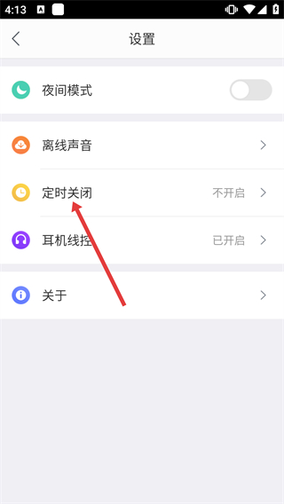 3、在设置界面,点击“定时关闭”选项,打开定时关闭功能对应的时间选择列表。