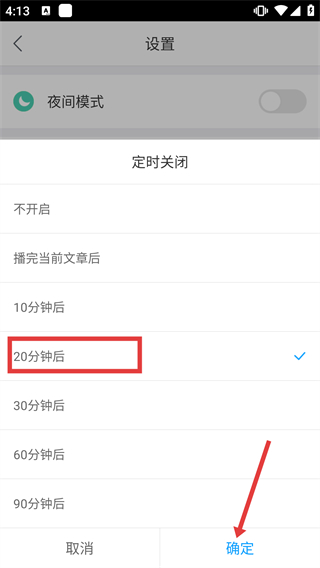4、在定时关闭的时间列表中选择“20分钟后”,点击“确定”按钮完成定时关闭的设置。