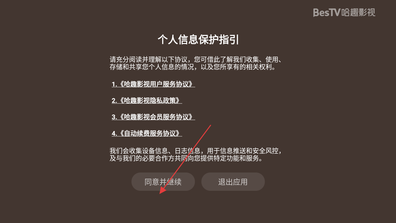 1、首次使用需阅读【哈趣影视用户服务协议】【哈趣影视隐私政策】等协议,点击【同意并继续】方可进入软件。