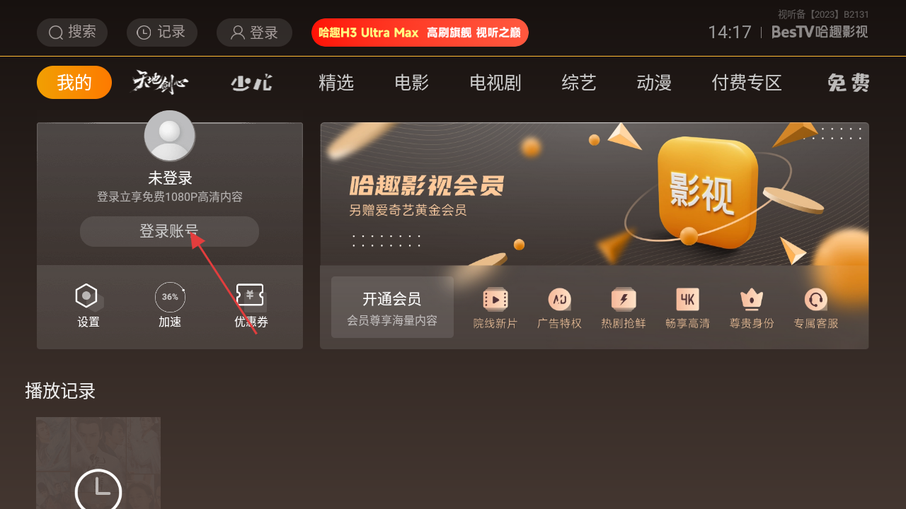 3、在【我的】板块中,点击【登录账号】按钮,可开启登录流程,登录后享高清内容等权益。