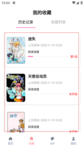 2、进入【收藏】页面后,可在【历史记录】和【收藏列表】中查看阅读过和收藏的漫画,了解上次阅读时间和进度。
