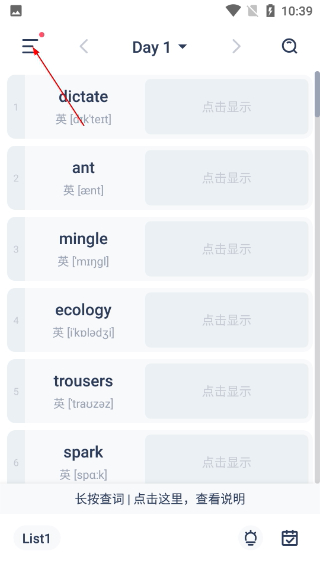 1、在单词学习页,点击左上角菜单按钮,进入功能导航界面。