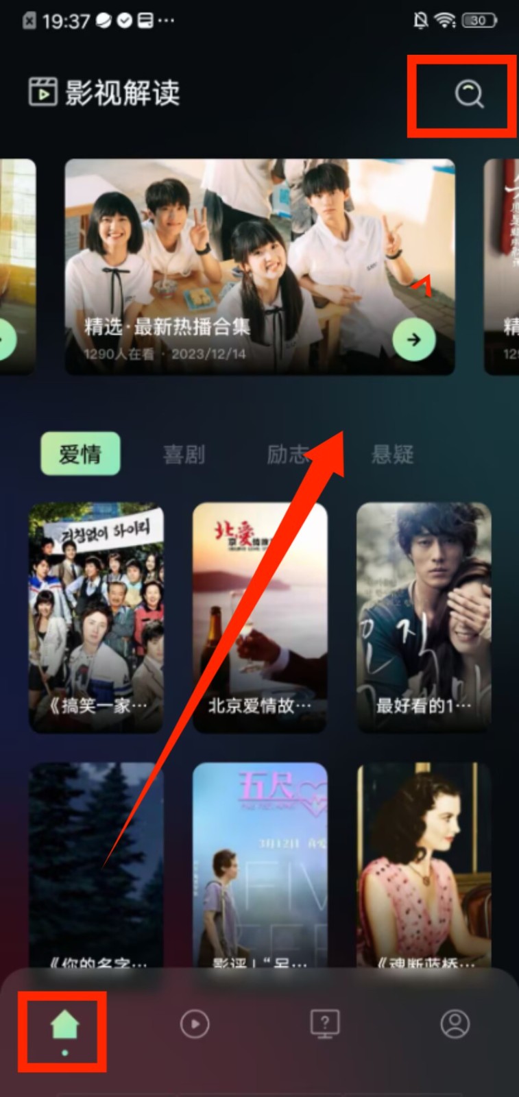 1、进入 “首页”,可通过右上角搜索功能查找内容,也能在爱情、喜剧等分类里浏览影视资源。