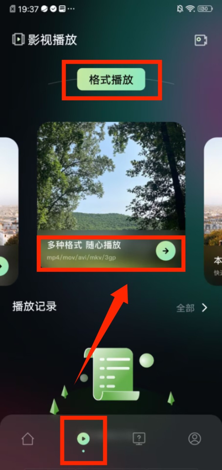 2、切换到 “播放” 页面,点击 “格式播放” 板块,能选择适配 mp4、mkv 等多种格式的影视内容。