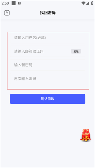 4、在找回密码界面,输入用户名、邮箱验证码、新密码并再次确认密码,点击【确认修改】按钮,即可完成密码找回,重新登录账号。