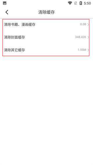 4、在缓存清理页面,可选择【清除书籍、漫画缓存】【清除封面缓存】【清除其它缓存】等类型,按需清理以优化软件运行空间。