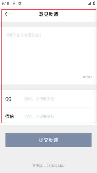 4、在【意见反馈】页,在输入框中填写建议,选填QQ/微信;填写完成后点击“提交反馈”,即可完成建议的提交。