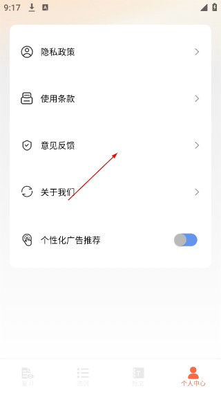 3、在【个人中心】页选择“意见反馈”选项,进入意见反馈提交界面。
