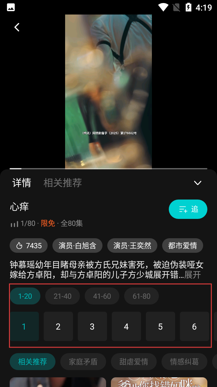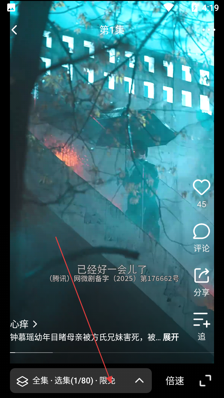 3、进入【心痒】播放页面,可看到剧集播放画面,点击下方【全集·选集(1/80)·限免】区域。
