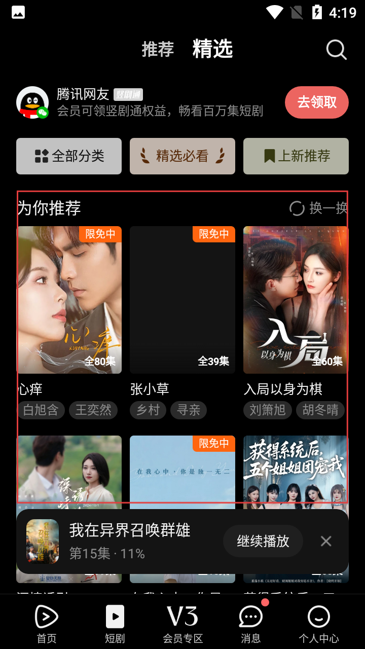 1、打开腾讯视频,进入首页,能看到各类影视推荐,点击底部【短剧】,进入短剧页面。