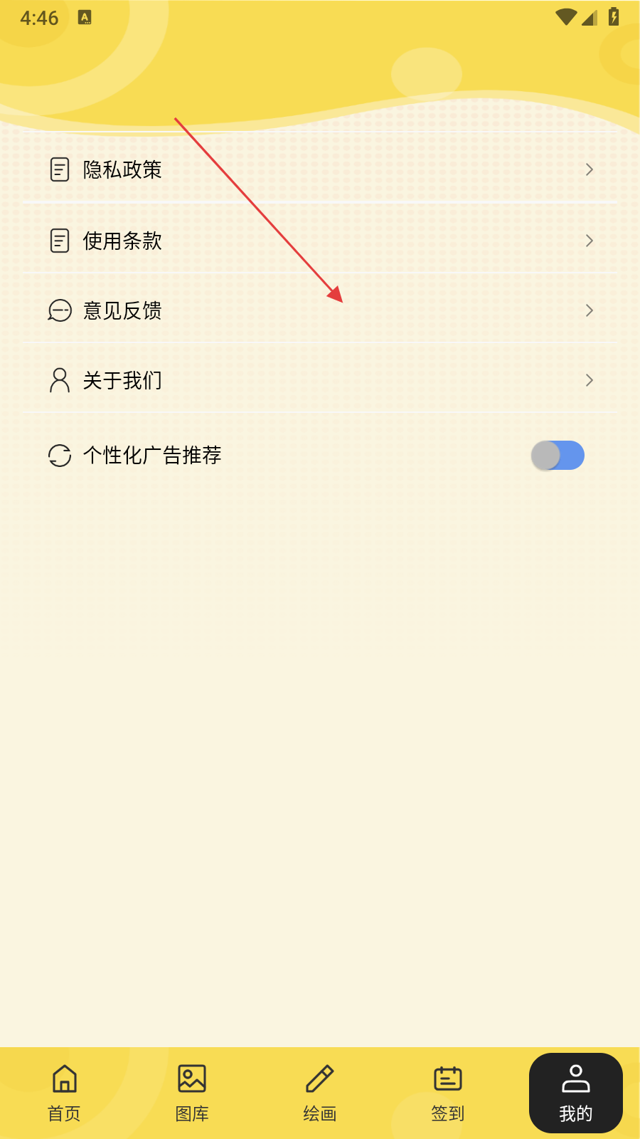 3、在个人中心页面,点击【意见反馈】,可进入反馈页面提交对软件的建议。