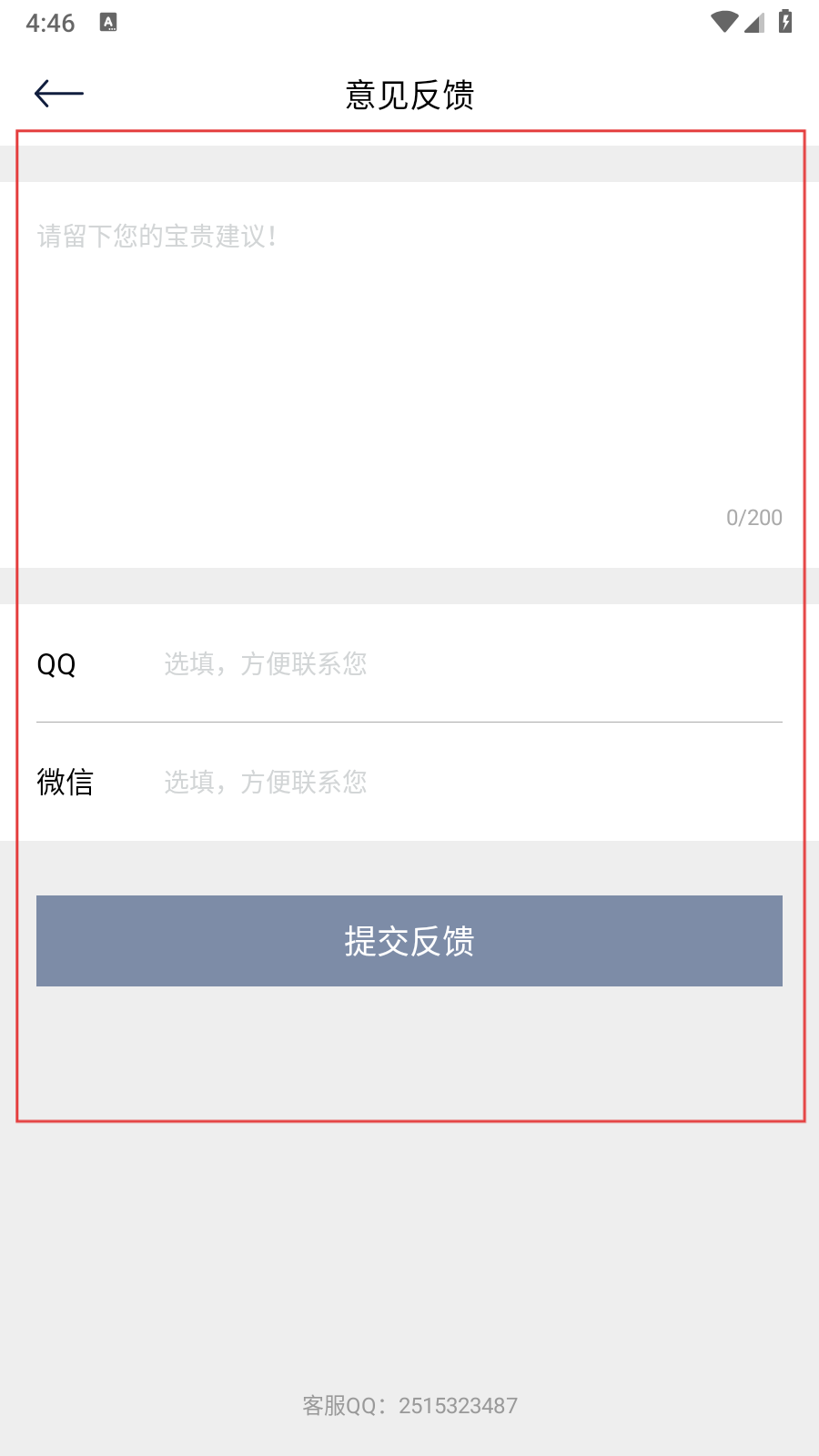 4、在意见反馈页面,填写建议内容,选填QQ或微信以便联系,然后点击【提交反馈】,即可将建议提交给软件方。