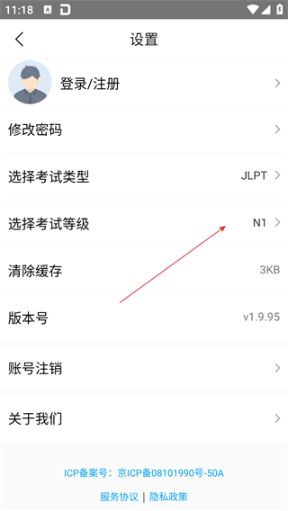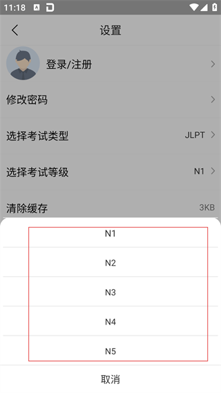 3、在设置页面中,点击【选择考试等级】选项(当前默认等级为N1),弹出JLPT考试等级选择菜单。