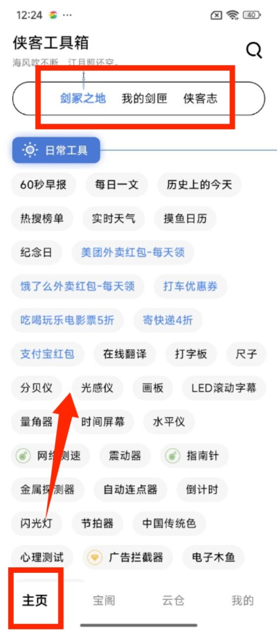 1、进入主页,在 “剑冢之地” 等标签下,可使用 60 秒早报、实时天气等日常工具,满足各类生活需求。