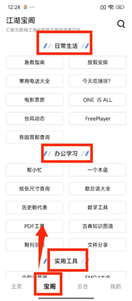 2、切换到宝阁页面,在 “日常生活”“办公学习” 等板块,选择急救指南、数学工具等实用功能。