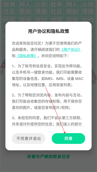 1、使用加豆社区前需阅读【用户协议和隐私政策】,若同意请点击【同意】以开启服务。