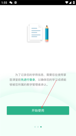 2、在登录引导页面,点击【开始使用】按钮,进入登录/注册选择页面。