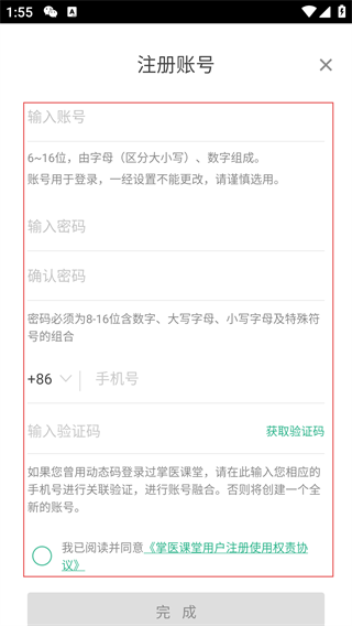 4、在注册信息填写页面,按要求输入对应信息,确认信息无误后点击【完成】按钮,即可完成账号注册。