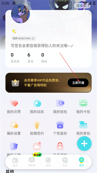2、在【我的】页面点击【立即开通】按钮,进入VIP会员开通页面。