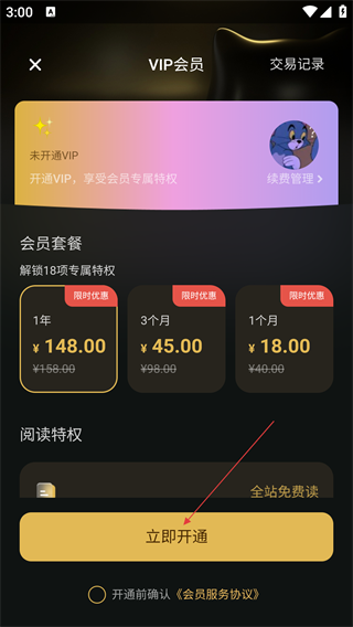 3、在VIP会员页面选择会员套餐,点击【立即开通】进入确认开通环节。