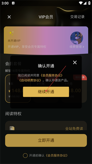 4、在确认开通弹窗中勾选协议后点击【继续开通】,完成VIP会员开通操作。