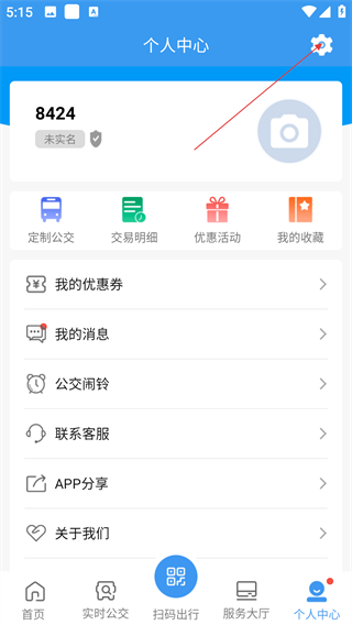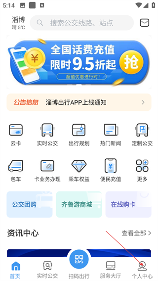 1、进入“淄博出行”App首页,点击底部【个人中心】进入个人页面。
