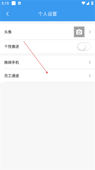 3、在个人设置页,点击【员工通道】选项,进入员工卡申请页面。