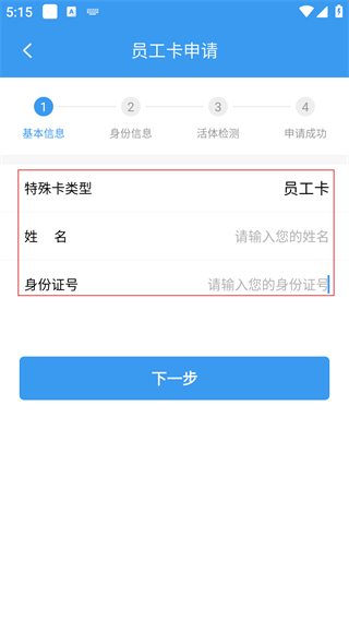 4、在员工卡申请的“基本信息”环节,输入姓名、身份证号,点击【下一步】,按流程完成身份信息填写等步骤,即可提交员工卡申请。