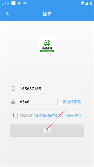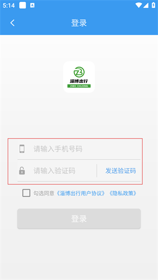 4、勾选“同意《淄博出行用户协议》《隐私政策》”后,点击【登录】按钮,完成账号登录,即可使用个人相关功能。